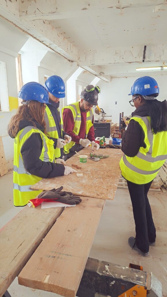 During the site walk‑through, the students gained first‑hand experience of what it truly means to work on a live construction project. The ASWS team explained each stage of the refurbishment process, including the removal, tagging and off‑site sandblasting of steel windows, before reinstatement, glazing and decoration. The session also covered the full scope of timber window refurbishment, with students learning about Repair Care resin techniques – and even completing a repair themselves to take away.